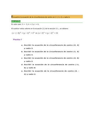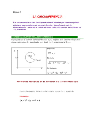 El documento describe la ecuación analítica de una circunferencia. Define una circunferencia como una curva cerrada formada por todos los puntos que están a la misma distancia (radio) de un punto central (centro). Explica que la ecuación de una circunferencia con centro (h, k) y radio r es (x-h)2 + (y-k)2 = r2. Luego proporciona ejemplos resueltos de cómo escribir la ecuación para circunferencias dadas.