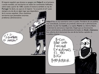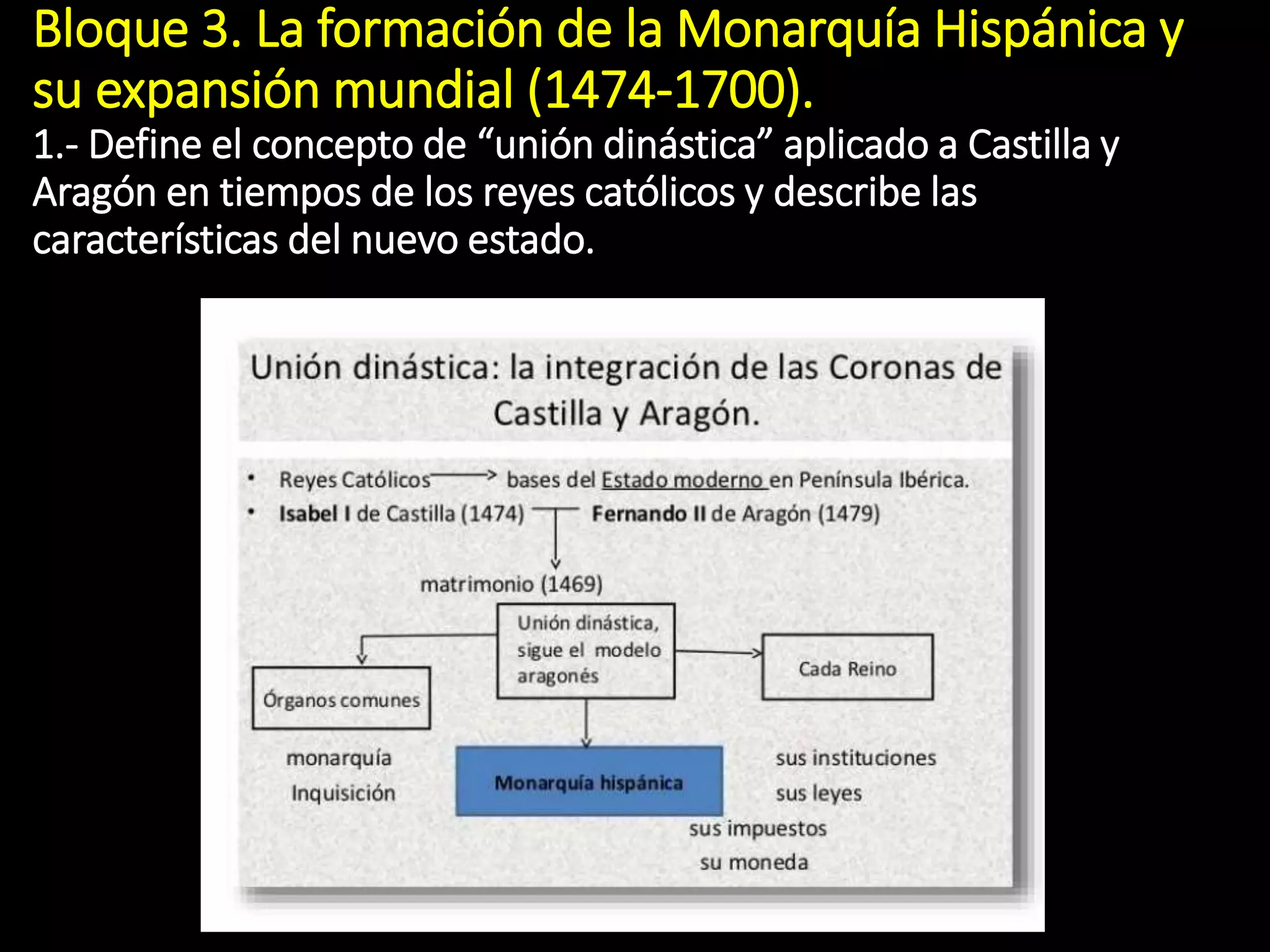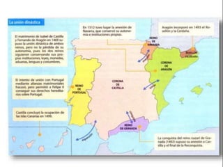 La formación de la Monarquía Hispánica a través de la unión dinástica de Castilla y Aragón bajo los Reyes Católicos llevó a la unificación política de España y sentó las bases para el futuro Imperio Español. Los eventos más relevantes de 1492 incluyeron la conquista de Granada y la expulsión de los judíos, así como el descubrimiento de América por Cristóbal Colón. El Imperio Español alcanzó su máxima extensión bajo Carlos I y Felipe II a través de la