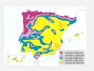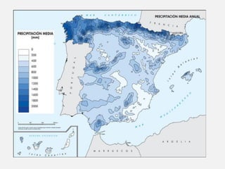 Este documento presenta un resumen de dos temas sobre el clima de España. Explica los elementos climáticos como la temperatura, precipitación e insolación, y cómo se distribuyen en el país. También describe los principales tipos de clima en España y los factores que influyen en ellos.