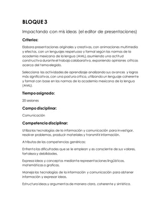 Este documento describe un bloque de 20 sesiones cuyo objetivo es que los estudiantes elaboren presentaciones creativas utilizando animaciones multimedia y efectos, con un lenguaje formal y respetuoso de acuerdo con las normas de la Academia Mexicana de la Lengua. Los estudiantes analizarán sus avances con una postura crítica y usarán las tecnologías de la información para investigar, resolver problemas y transmitir información de manera clara y coherente. El reto será lograr que los estudiantes mejoren sus aprendizajes mediante el