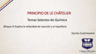 El principio de Le Châtelier establece que cuando se modifica un factor externo como la presión, temperatura o concentración en un sistema químico en equilibrio, el equilibrio se desplazará para contrarrestar el cambio y establecer un nuevo equilibrio. Cambios en la concentración, temperatura o presión afectarán el equilibrio desplazándolo hacia los reactantes o productos para oponerse al cambio, mientras que los catalizadores no afectan el equilibrio al no intervenir químicamente en la reacción.