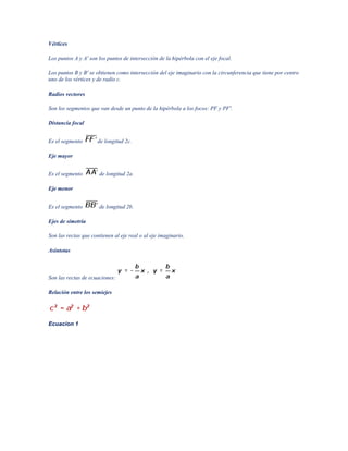 La hipérbola es el lugar geométrico de los puntos cuya diferencia de distancias a dos focos fijos es constante. Tiene elementos como focos, ejes focal y secundario, vértices, radios vectores, distancia focal y ejes de simetría. Se plantean 4 problemas para hallar la ecuación de hipérbolas dadas sus focos, vértices y centros, y se pide determinar elementos de otras hipérbolas dadas por sus ecuaciones.