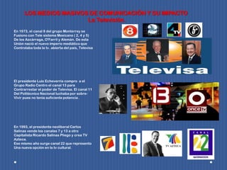 El documento describe el impacto de la globalización y los medios masivos de comunicación en la cultura mexicana. Explica cómo la televisión, radio e internet han contribuido a la estandarización cultural y sociedad de consumo en México, afectando la identidad nacional. También resume las manifestaciones artísticas mexicanas destacadas y los esfuerzos del gobierno para difundir y preservar la cultura a nivel nacional e internacional.