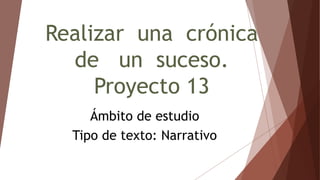 Este documento presenta información sobre la crónica como género periodístico narrativo. Explica que la crónica tiene como objetivo principal informar sobre un suceso de manera ordenada cronológicamente. Incluye características como el uso de referencias de tiempo, espacio y persona, así como recursos lingüísticos para narrar los hechos de forma clara y completa. También presenta ejemplos de tiempos verbales y elementos discursivos empleados en una crónica.