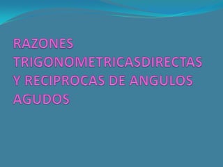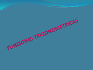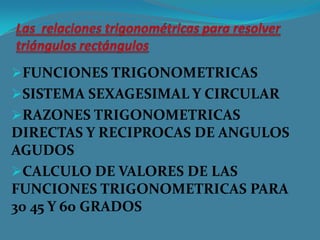 El documento describe los sistemas sexagesimal y circular para medir ángulos, las funciones trigonométricas y sus relaciones en triángulos rectángulos, y cómo calcular valores de las funciones para 30, 45 y 60 grados. Explica que las funciones describen las relaciones entre los lados del triángulo y su hipotenusa o catetos, y que el sistema circular usa radianes como unidad de medida.