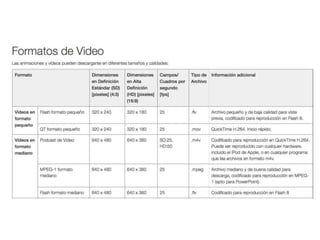 El documento describe diferentes aspectos de la edición de video, incluyendo formatos de video como AVI, ASF, WMV, MPEG y sus códecs asociados. También describe técnicas de animación como frame a frame, stop motion e interpolación, y técnicas de edición en línea de tiempo como inserciones, superposiciones y extracciones. Además, discute factores para determinar si se usará edición lineal o no lineal para proyectos de postproducción.