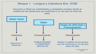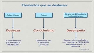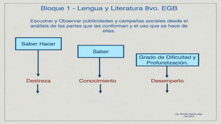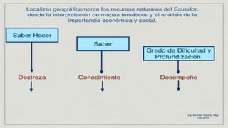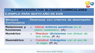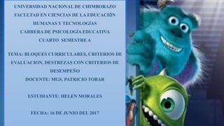 Este documento presenta información sobre bloques curriculares, criterios de evaluación, destrezas con criterios de desempeño en la carrera de psicología educativa de la Universidad Nacional de Chimborazo. Explica que los bloques curriculares son agrupaciones de aprendizajes básicos definidos en términos de destrezas evaluables. Luego define criterios de evaluación e incluye un ejemplo. Finalmente, describe las destrezas con criterios de desempeño y cómo estas se utilizan para la planificación, enseñanza,