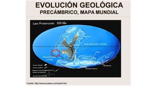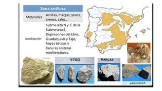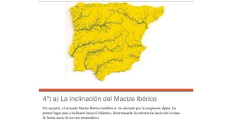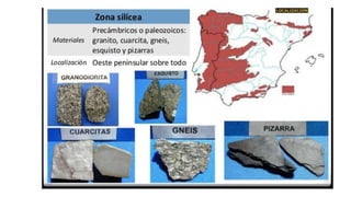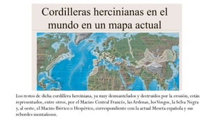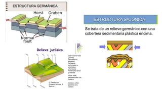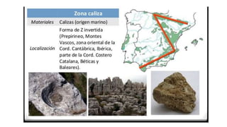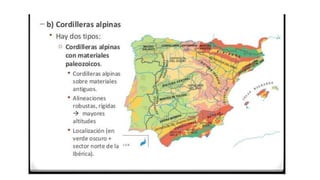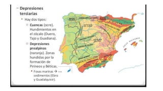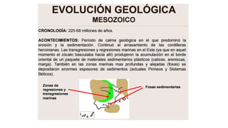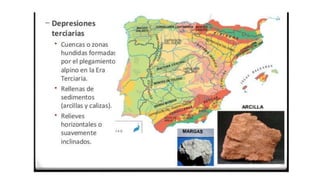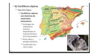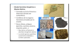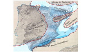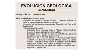El documento describe la geología de España, dividiéndola en cuatro dominios geológicos principales: el Macizo Ibérico formado por rocas precámbricas y paleozoicas; las cuencas cenozoicas que contienen sedimentos del Mesozoico y Cenozoico; los orógenos recientes como los Pirineos y Cordilleras formados durante la orogenia alpina; y las Islas Canarias de origen volcánico desde el Mioceno. Además, resume brevemente la historia geológica de la Pen