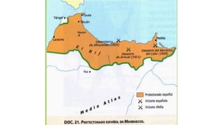 1. El documento describe la crisis política y social en España durante el reinado de Alfonso XIII desde 1902 hasta la dictadura de Primo de Rivera en 1923. 2. Los factores que contribuyeron a la crisis incluyen el descontento militar, el crecimiento de los movimientos obrero y nacionalista, y los problemas resultantes de la guerra en Marruecos. 3. En 1923, el general Miguel Primo de Rivera llevó a cabo un golpe de estado con el pretexto de resolver la inestabilidad, dando inicio a su dictadura.