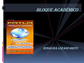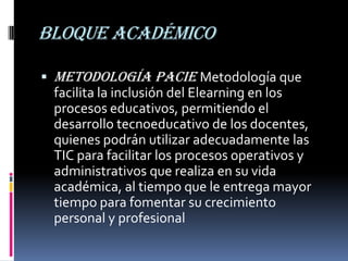 Este documento describe las diferentes secciones de un bloque académico. Incluye secciones como comprobación, construcción, rebote, exposición, información, comunicación, interacción, negociación y retroalimentación. El objetivo general es promover el procesamiento de información, la elaboración de actividades, la construcción colectiva del conocimiento y la interacción entre participantes.