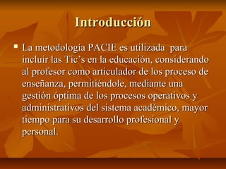 Este documento describe la metodología PACIE para incluir las TIC en la educación. La metodología tiene 5 etapas: presencia del EVA, alcance a todas las instancias educativas, capacitación permanente, interacción de todos los integrantes y elearning. La etapa de interacción es clave para la colaboración y el constructivismo. El documento también explica la importancia del bloque académico del aula virtual para proporcionar contenido y promover la interacción entre estudiantes y tutores.