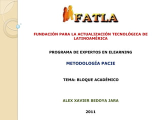 El documento describe la estructura general de un bloque académico en un aula virtual. El bloque académico contiene la información principal del curso y se compone de cuatro secciones: exposición, donde el estudiante obtiene información; rebote, donde comparte lo aprendido; construcción, donde analiza y discute propuestas; y comprobación, donde el tutor evalúa los conocimientos adquiridos.