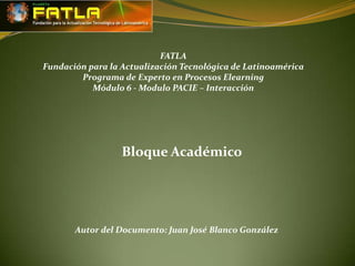 La metodología PACIE se utiliza para crear aulas virtuales e incluye cinco elementos: presencia, alcance, capacitación, interacción y elearning. Un bloque académico típico consta de cuatro secciones: exposición de información, actividades de autocrítica, construcción del conocimiento a través de análisis y discusión, y comprobación del aprendizaje a través de síntesis o verificación. El bloque académico es importante porque contiene los contenidos y actividades del curso.