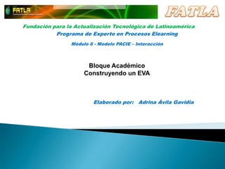 El documento describe las secciones principales para construir un Bloque Académico en un Entorno Virtual de Aprendizaje (EVA). El Bloque Académico presenta la información sobre la materia de estudio, incluyendo el contenido, las fechas y el tiempo de duración. Contiene cuatro secciones: Exposición, donde se presenta el contenido; Rebote, con actividades de autocrítica; Construcción, para debates y construcción de conocimiento; y Comprobación, con actividades de autoevaluación. Se recomienda que el Bloque Acadé