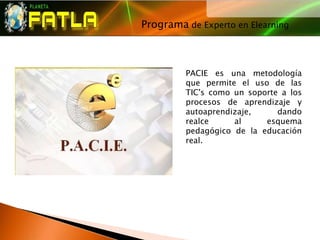 Este documento describe la metodología PACIE para el aprendizaje electrónico (e-learning). PACIE se basa en cinco procesos secuenciales: presencia, alcance, capacitación, iteración y e-learning. Divide el contenido en bloques académicos, exposición, rebote, construcción y comprobación para guiar a los estudiantes a través de la información, actividades y evaluaciones.
