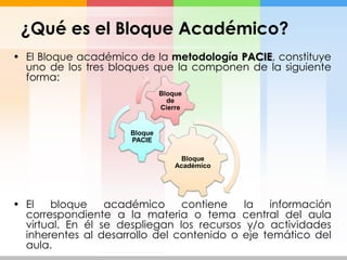 Este documento describe el Bloque Académico de la metodología PACIE para el diseño de aulas virtuales. El Bloque Académico contiene los recursos y actividades para desarrollar los contenidos temáticos del curso y lograr los objetivos académicos. Se divide en cuatro secciones: Exposición, Rebote, Construcción y Comprobación, las cuales permiten exponer, discutir y verificar el aprendizaje de los contenidos de forma dinámica e interactiva.