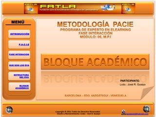 El documento describe la metodología PACIE para la educación virtual. PACIE son las siglas de las cinco fases: Presencia, Alcance, Capacitación, Interacción y E-Learning. La fase de interacción es la más importante porque promueve la participación entre estudiantes para construir conocimiento de manera colaborativa. Los entornos virtuales de aprendizaje (EVA) deben seguir la estructura de PACIE y contener bloques académicos con secciones para exposición, discusión, construcción y evaluación del conocimiento.