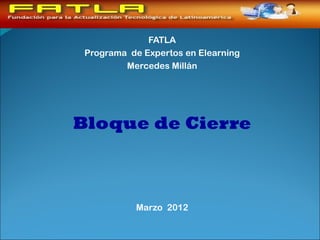 Este documento describe la estructura del bloque de cierre de un curso en línea. El bloque de cierre consta de dos secciones: 1) negociación, que permite finalizar procesos tutoriales y evaluar conocimientos; y 2) retroalimentación, que busca mejorar cursos recogiendo opiniones de estudiantes. El bloque de cierre es fundamental para culminar procesos pendientes, recoger comentarios y evaluar el éxito del curso.