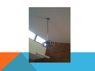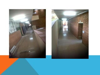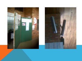 Este documento presenta el plano de evacuación del Bloque D de una universidad, el cual muestra las rutas de acceso y salida. Identifica posibles riesgos como lámparas colgantes, tableros informativos y la construcción en curso, y propone acciones de mejora como fortalecer estructuras y asegurar objetos a las paredes para prevenir daños en caso de emergencia. Además, señala la ubicación de salones, baños, oficinas y otros espacios en el bloque.