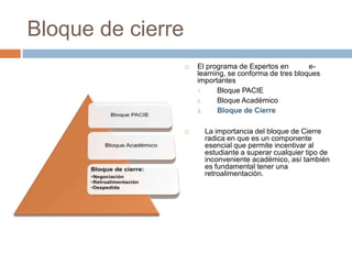 El documento describe el bloque de cierre de un programa de expertos en e-learning. El bloque de cierre incluye una evaluación final, una ceremonia de graduación donde se otorgan certificados, y una sección de despedida para que estudiantes y tutores compartan impresiones. El bloque de cierre busca incentivar a los estudiantes a superar dificultades académicas y ofrecer retroalimentación.