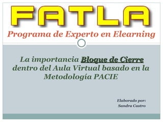 El documento describe la estructura ideal de un aula virtual basada en la metodología PACIE. Explica que el aula debe generar procesos de interacción que motiven el aprendizaje. Describe la estructura en bloques que incluyen información, comunicación, interacción, exposición, retroalimentación y cierre. Señala que el bloque de cierre, aunque es el último, es importante porque permite la negociación, retroalimentación y emisión de certificados de graduación a los estudiantes aprobados.