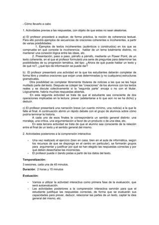 Este documento propone una actividad didáctica interactiva para mejorar la comprensión lectora de estudiantes de 4o de la ESO. La actividad utilizará ejercicios en línea para practicar la comprensión de textos y se llevará a cabo en 3 sesiones de 45 minutos cada una. Antes y después de los ejercicios en línea, los estudiantes participarán en discusiones guiadas para reflexionar sobre los procesos de comprensión lectora. El objetivo es que los estudiantes mejoren su capacidad de comprender text