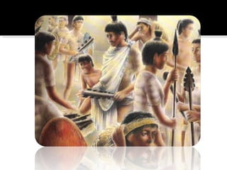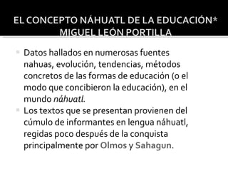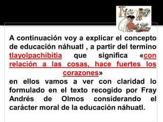 El documento describe la educación entre los pueblos nahuas prehispánicos en México, enfocándose en los conceptos de "rostro y corazón" como el punto de partida de su concepción de la educación. Los nahuas buscaban dar "sabiduría a los rostros ajenos" a través de enseñar cantos, calendarios, interpretación de sueños e historia para formar "rostros sabios y corazones firmes".