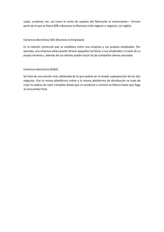 El documento describe los diferentes tipos de comercio electrónico, incluyendo B2B, B2C, B2E y B2B2C. B2B se refiere a transacciones comerciales entre empresas, como la compra de materiales. B2C involucra la venta directa de productos y servicios a consumidores individuales. B2E cubre las relaciones entre empresas y sus propios empleados. B2B2C representa una cadena de valor integrada que lleva los productos desde los fabricantes hasta los consumidores finales.