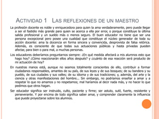 El documento contiene varias actividades sugeridas para maestros de escuela secundaria. Describe dos clases, una de historia donde los estudiantes estaban aburridos y desinteresados, y una de matemáticas donde la maestra logró captar la atención de los estudiantes al darles confianza y permitirles opinar. También habla sobre la importancia de que los maestros amen sinceramente su profesión y tengan en cuenta cómo sus acciones pueden influir en los estudiantes.