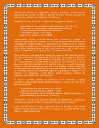 Este documento presenta las características del trabajo docente en la escuela secundaria. Aborda temas como la diversidad de tareas del profesor, el trabajo con grupos de estudiantes, y las exigencias de trabajar con adolescentes. También incluye sugerencias de actividades para los estudiantes como observar la organización del aula, el uso del tiempo en clase, y analizar cómo los profesores toman en cuenta las actitudes de los estudiantes.