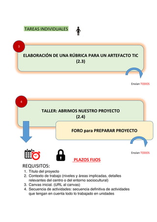 Este documento presenta el bloque II de evaluación del Aprendizaje Basado en Proyectos. Incluye las tareas grupales y individuales que los estudiantes deben completar entre el 30 de septiembre y el 4 de noviembre. Las tareas grupales son diseñar el proyecto mediante un canvas, planificar la evaluación del proyecto y elaborar una rúbrica para un artefacto TIC. Las tareas individuales son participar en foros y talleres para preparar el proyecto y crear un periódico digital. El documento también especifica los requ