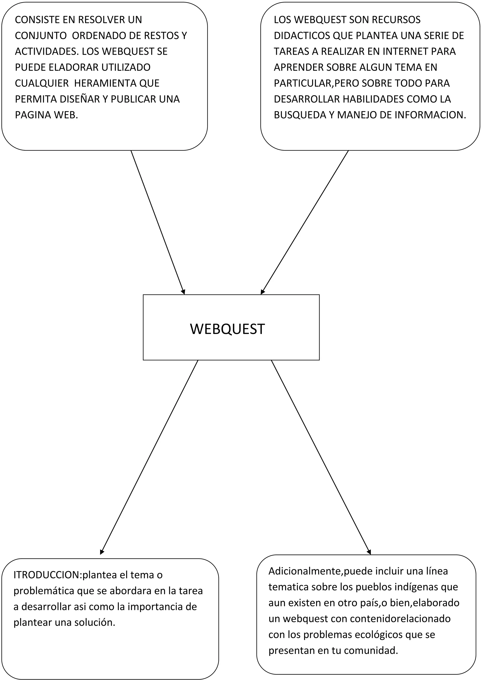 El documento describe los WebQuest como recursos educativos que consisten en una serie de tareas relacionadas con un tema particular que los estudiantes deben completar utilizando recursos de Internet. Los WebQuest guían a los estudiantes a través de actividades secuenciales para aprender y desarrollar habilidades como la búsqueda y el manejo de información de manera autodirigida.