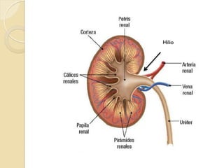El riñón contiene alrededor de 1 millón de nefronas por riñón, cada una compuesta de un glomérulo, túbulo contorneado proximal, asa de Henle y túbulo contorneado distal. La barrera de filtración está formada por la membrana basal y los podocitos. El riñón filtra la sangre para formar orina, equilibrar electrolitos y ácidos, y regular la tensión y el metabolismo del calcio. El filtrado glomerular se reabsorbe y se concentra a lo largo de los