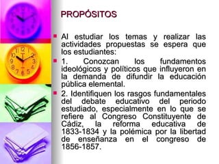 El documento trata sobre la educación en México durante el siglo XIX. Discute los fundamentos ideológicos y políticos que influyeron en la demanda de difundir la educación pública elemental, así como el debate educativo durante este periodo, incluyendo el Congreso Constituyente de Cádiz, la reforma educativa de 1833-1834 y la polémica sobre la libertad de enseñanza en 1857. También analiza el Artículo Tercero de la Constitución de 1857 y las prácticas escolares y condiciones de los maestros durante