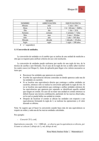 El documento describe las unidades de medición para tiempo, distancia, peso y volumen. Explica las abreviaciones y equivalencias de cada unidad, como kilogramos, litros, metros, minutos, etc. También describe cómo realizar conversiones entre unidades utilizando reglas de tres o equivalencias directas. Finalmente, presenta fórmulas para calcular el perímetro y área de figuras geométricas como cuadrados, rectángulos, triángulos y círculos.