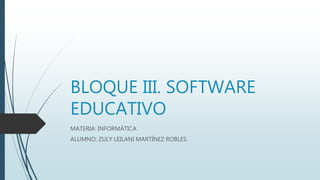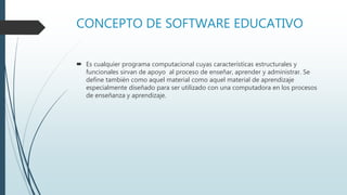El documento describe los diferentes tipos de software educativo, incluyendo programas tutoriales, programas de ejercitación, bases de datos, simuladores, constructores y programas herramientas. El software educativo se define como aquel material diseñado para ser utilizado en la enseñanza y el aprendizaje que permite la interactividad y retroalimentación, facilita representaciones animadas, y apoya el desarrollo de habilidades a través de la práctica.