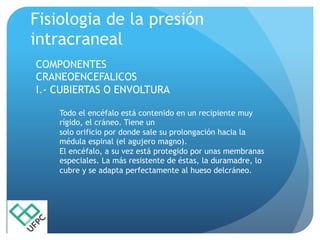 El documento describe la fisiopatología de la presión intracraneal y la meningitis. Explica que cualquier aumento del volumen cerebral, del líquido cefalorraquídeo o de la sangre dentro del cráneo puede causar hipertensión intracraneal. También detalla los síntomas, signos y tratamiento de la meningitis aguda, que se produce por la inflamación de las meninges cerebrales, generalmente por un agente infeccioso.