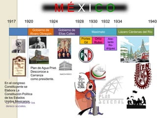 La Primera Guerra Mundial terminó en 1918 con la victoria de los aliados, incluidos Estados Unidos, Inglaterra y Francia. Los años 1920 fueron prósperos, pero la crisis económica de 1929 extendió la Gran Depresión a nivel mundial. En México, la Constitución de 1917 estableció un gobierno federal y democrático y protegió los derechos sociales y la propiedad ejidal, cerrando el ciclo de la Revolución Mexicana.