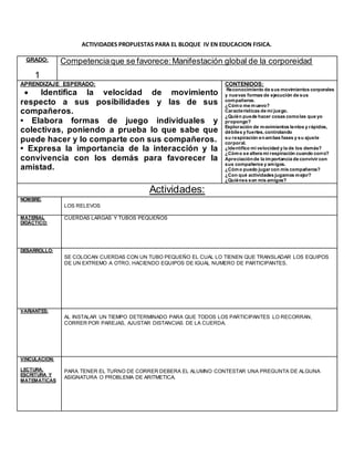 Este documento presenta varias actividades propuestas para educación física en grados 1, 2 y 3. En cada grado, se describen los aprendizajes esperados, contenidos y algunas actividades con sus reglas y variantes. Las actividades incluyen juegos que involucran el desarrollo de habilidades motrices, trabajo en equipo y respeto de reglas, y se proponen vincularlas con otras asignaturas a través de preguntas o problemas matemáticos.