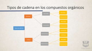 Este documento resume los diferentes tipos de cadenas y fórmulas de compuestos orgánicos, incluidas cadenas acíclicas, ciclicas y aromáticas. También explica los diferentes tipos de carbono, isomería, incluida la estructural, funcional y estereoisomería. La isomería puede ocurrir cuando compuestos tienen la misma fórmula molecular pero diferentes estructuras o orientaciones espaciales de los átomos.