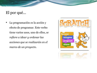 Este documento introduce el tema de la programación con Scratch. Explica que la programación implica idear y ordenar las acciones de un proyecto y que con Scratch los estudiantes pueden representar eventos y procesos mediante instrucciones de código. También describe que las actividades propuestas permitirán a los participantes desarrollar habilidades de pensamiento lógico y aprender el lenguaje de programación Scratch a través de retos que irán mejorando sus ideas para crear un producto relacionado con la familia y el mundo.