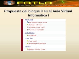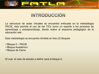El documento describe la metodología PACIE para aulas virtuales, la cual se divide en tres bloques. Se enfoca en el Bloque 0, que complementa aspectos pedagógicos, sociales, técnicos y administrativos para desarrollar habilidades de aprendizaje autónomo. El Bloque 0 contiene secciones de información, comunicación e interacción para presentar el curso, tutor y evaluación, así como informar a los estudiantes y promover el trabajo cooperativo.