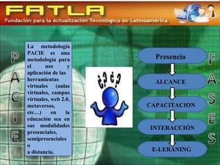 La metodología PACIE es una metodología para el uso de herramientas virtuales en la educación que se centra en la interacción. El bloque más importante es la interacción, que se ha convertido en el eje de la comunicación e intercambio de información entre estudiantes. El bloque 0 muestra al estudiante cómo funciona el aula virtual, incluyendo los espacios para información del tutor, contenidos, evaluaciones, foros y ayuda con dudas.