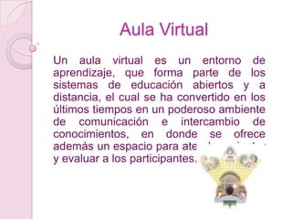 El documento describe la estructura y función de un aula virtual y su Bloque 0 - PACIE. Un aula virtual es un entorno de aprendizaje en línea que ofrece espacio para comunicación e intercambio de conocimiento. El Bloque 0 proporciona información sobre el curso, facilita la interacción entre estudiantes y tutor, y motiva el aprendizaje colaborativo a través del método PACIE (Presencia, Alcance, Capacitación, Interacción y E-learning).