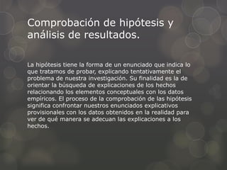 El documento habla sobre la comprobación de hipótesis y el análisis de resultados en la investigación. Explica que la hipótesis es un enunciado tentativo que orienta la búsqueda de explicaciones confrontando los conceptos con los datos empíricos. Luego, detalla los pasos para comprobar las hipótesis que incluyen diseñar y ejecutar una prueba, elaborar datos e inferir una conclusión. En resumen, enfatiza la importancia de la hipótesis, introducción, conclusión y partes complementarias en cualquier trabajo