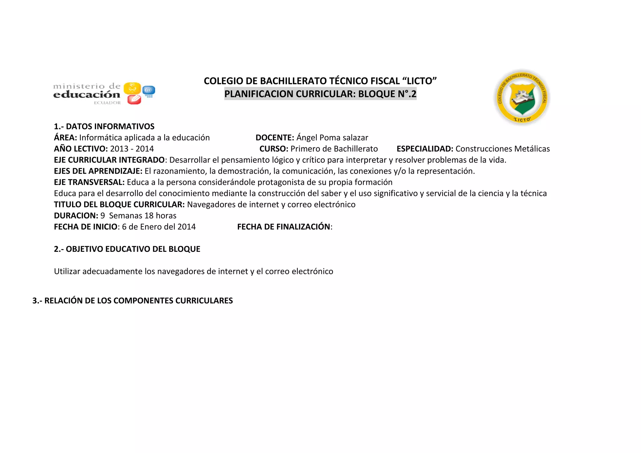 Este documento presenta un plan de estudios de 9 semanas para un curso de primer año de bachillerato en construcciones metálicas. El plan se centra en enseñar a los estudiantes a usar navegadores de internet y correo electrónico de manera responsable y efectiva. El objetivo es que los estudiantes aprendan a utilizar estas herramientas para investigar temas de manera confiable y comunicarse. El plan describe las estrategias, recursos y métodos de evaluación que se usarán, incluidas discusiones, ejercicios práct