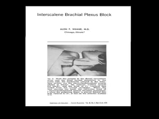Este documento describe dos técnicas para el bloqueo del plexo braquial: la interescalénica y la supraclavicular. La técnica interescalénica bloquea el tronco superior y medio del plexo braquial y se usa para cirugía del hombro, antebrazo y mano. La técnica supraclavicular bloquea el codo, antebrazo y mano y está indicada para cirugía. Ambas técnicas describen puntos de referencia anatómicos y posiciones del paciente. Se mencionan posibles complic