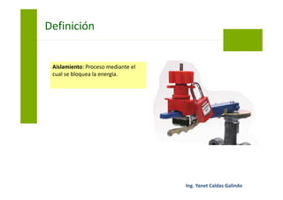 El documento describe los procedimientos de bloqueo y etiquetado para trabajos de mantenimiento. Incluye información sobre aislamiento de energía, bloqueos personales y grupales, cajas de bloqueo, dispositivos de bloqueo y etiquetado personal. Detalla los pasos a seguir que incluyen desenergizar equipos, colocar bloqueos y etiquetas personales, verificar ausencia de energía, retirar herramientas al finalizar y quitar bloqueos. También cubre procedimientos para bloqueo de equipos de alto voltaje y retiro forz