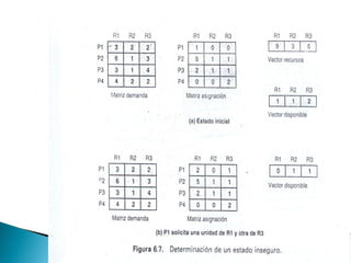 Este documento discute problemas de concurrencia como el interbloqueo e inanición. Explica que el interbloqueo ocurre cuando procesos compiten por recursos de forma que se bloquean mutuamente, y presenta estrategias para prevenirlo como ordenar solicitudes de recursos o expulsar procesos. También cubre tipos de recursos y mecanismos de comunicación entre procesos en UNIX como tuberías, mensajes y memoria compartida.