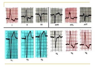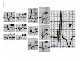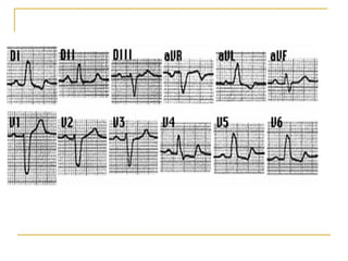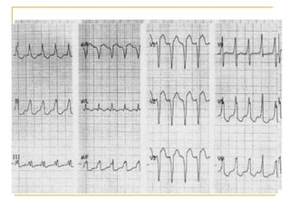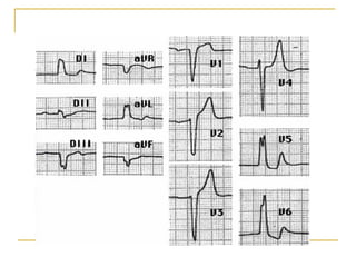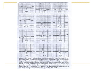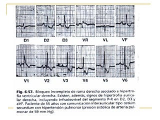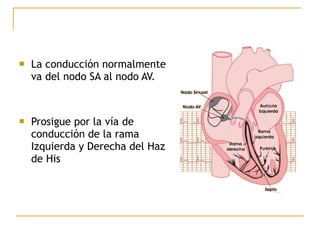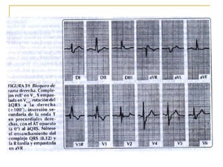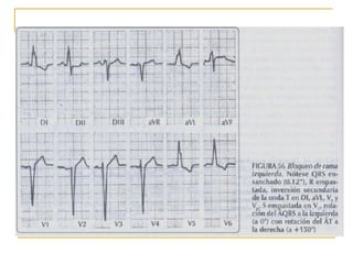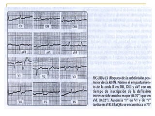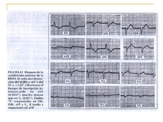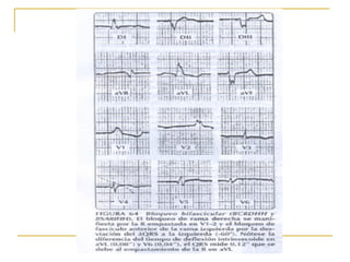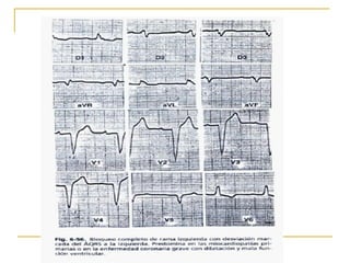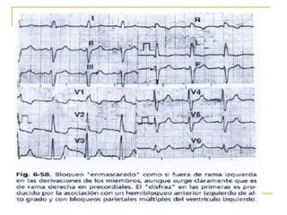 El documento describe diferentes tipos de bloqueos de rama que pueden ocurrir en el sistema de conducción cardíaco. Explica los bloqueos de rama derecha e izquierda, así como bloqueos fasciculares del haz de His izquierdo. También cubre bloqueos bifasciculares que implican dos ramas, y el bloqueo trifascicular más raro que afecta a las tres ramas principales.